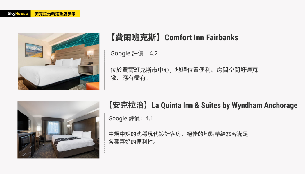 🛏️ 住宿參考:Comfort Inn Fairbanks 或同級飯店