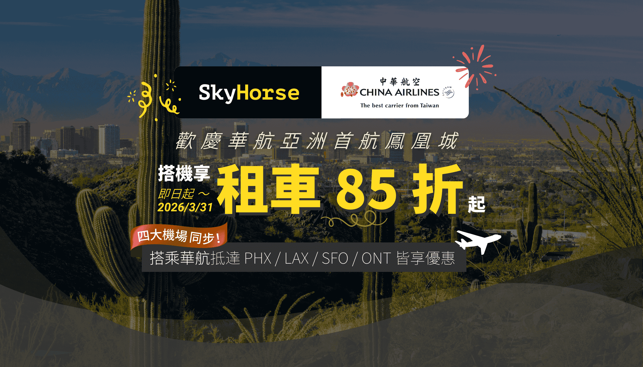 慶祝中華航空自 2025/12/3 正式開航「台北-鳳凰城(PHX)」新航線,Sky Horse 特別推出華航乘客專屬租車禮遇: